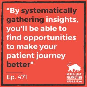 The first is to systematically gather insights. Systematically gather insights, what do I mean by that? I want you to talk about, hear from, learn from patients and employees. Systematically gather insights by having three to five open-ended questions that you ask patients and employees through different channels at different times, and then you track as much as you hear qualitatively. So, you’re qualitatively, systematically gathering insights by talking to employees, talking to patients, asking them, what’s the one thing they’d change to improve the patient journey? What’s the one reason that they stay as an employee or as a patient? Ask them these open-ended questions to systematically gather feedback. But then also, systematically gather feedback by studying the length of time that a patient who calls your call center is on the line, the length of time they might be on hold, the length of time it takes to get them to resolution. Look at how long your patients are on your website, and what are they doing? Are they able to get the information they need? Quickly? Or are they coming to your website and leaving immediately? That’s what I talked about in step one, systematically gather insights. You want to look at what you see that are trends about your patients, what’s their location? Where are they from? What’s their age? What’s their biggest concern? What’s the thing that made them come to you? You’re asking these qualitative open-ended questions, you’re combining that with numerical data, quantitative data that you have in your reporting. By systematically gathering insights, you’ll be able to find opportunities to make your patient experience, your patient journey better, which will then lead to more patients, and keep the existing ones and could very well lower your costs.