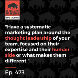 And the sixth no-bullshit marketing strategy for architectural firms is do real thought leadership of your principles and your key talent, architects-wise. And I say real thought leadership because if you take the time to be intentional about that and you have a systematic marketing plan around the thought leadership of your team, it’s going to be focused on their expertise and their human side. And what I think happens right now is we get too much of one or the other. We either get too much of the expertise and not enough of the human side, or we have someone trying to be artsy, and they’re talking about that person’s dog and that they like this or they like that, instead of combining the two. Let’s talk about their expertise and slip in what makes them different and what makes them human. So that is the sixth part of the No BS thought leadership, being systematic and intentional about No BS thought leadership, so you make it about them – those key target audiences that I keep emphasizing that you have to drill down those key target audiences, so you understand the trends about them and you can systematically gather insights about that real drilled down target audience, not just oh, we work in healthcare. Do the real drill down.