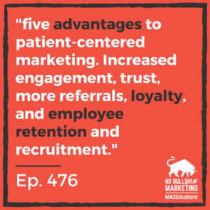The fifth benefit of patient centered marketing is it helps with employee retention and recruitment. Why? Because if you have this environment I’ve described – the first four of increased engagement, building trust, more referrals, creating loyalty – it is going to help the environment. Your employees are going to have a better environment. They’re going to communicate more with the patients, the patients are going to be more positive, the entire culture is going to shift. And so you’ll keep employees longer, but they’ll also share their positive experience with potential employees. They’ll share the culture stories with potential employees. So a patient-centered marketing approach also helps with recruiting and retention. So those are five major benefits of patient-centered marketing that you can take advantage of at your organization if you’re intentional and committed to patient-centered marketing.