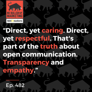 The first is it’s talking about open communication. And I like to say the truth about open communication. And the truth about open communication is confronting the brutal facts, confronting the brutal facts. That’s from a book Good to Great, one of the seminal business books of all time, and Good to Great talked about confronting the brutal facts. I found, throughout my career, that that wasn’t the case. The brutal facts were often ignored or were hoped that they would go away. So by confronting the brutal facts is having self-awareness of what you’re bringing to the table, both good and not so good, by being open and honest about your competitive advantages and competitive disadvantages as a company. So that’s confronting the brutal facts, gathering the insights, talking about it openly, and confronting what isn’t, what it should be, and working your best way to get there. Open communication, the truth about open communication is also that directness that I talked about. But no bullshit doesn’t mean that you just tell someone they’re full of shit or they’re wrong, or you get in somebody’s face. No, it’s direct, but caring. Direct but caring. Now, I’m not going to lie and say that I haven’t had a shitty tone, or that I haven’t had a look on my face that was because I couldn’t hold back that nonverbal. So I’m not claiming everybody on my team has the perfect delivery, because they don’t. But what we strive to do is be direct, yet caring. Direct, yet caring. Direct, yet respectful. That’s part of the truth about open communication. Transparency and empathy. So the first core value is around open communication, or just the word communicate, and it’s about those things, confronting the brutal facts being direct, but caring, direct, but respectful, being open and transparent and having empathy towards others.