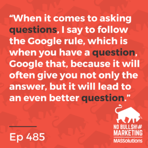 With a core value, at MASSolutions, we break it down and talk about the word ‘think.’ And we want everyone to use that as a core value. And the first part of think is think for yourself. When you look at the power of deep thinking, starting off by thinking for yourself, is about self-managing, self-management. One of the ways that I coach and mentor team members, when I talk about think for yourself and self-management, is I say, ‘Ask yourself open-ended questions to yourself. Ask yourself open ended questions like, ‘Why might my teammate, my peer be responding to me this way? Why is the client thinking this misperception about what we’re doing? Why is the client’s client not doing this behavior or action that we’re working on?’’ When you ask yourself open-ended questions and you begin to make that a part of your system and process on a daily basis – but on a hourly basis, minute basis throughout the day, continually asking yourself open-ended questions and pondering the answers to your open-ended questions – that’s part of self management. Another part of self-management and think for yourself, here at MASSolutions as a core value and it can help you is, having that thirst for knowledge. And a thirst for knowledge is not just words, a thirst for knowledge is not just saying, ‘I want to learn as much as I can about my position at Company A,’ where you work. But a thirst for knowledge is wanting to learn more about each of your clients and your clients’ clients, wanting to learn more about things, subjects, anything, just constantly wanting to ask questions, listen and learn. That’s the thirst for knowledge that we want to be part of our culture here. But I would encourage you, as a loyal No BSer watching this show, listening to the audio, that if you can have that thirst for knowledge, and it’s a true thirst for knowledge, that enables you to think for yourself.