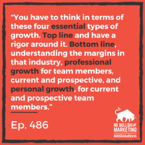 Commonly, people believe top line growth is the most important aspect of business. However, in marketing, you need to be thinking about top line and bottom line growth, as well as the personal and professional growth of your employees. These four types are all equally significant and interconnected. In episode 486, Dave Mastovich talks about how to apply No BS Marketing and these four types of growth to change the world.