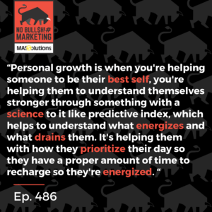 Those are two, but you also need to be focused on your people. And there has to be professional growth. They get better at the skill you’ve hired them to do. So third, a central type of growth. And there has to be personal growth. Or they grow as a person, how they think, how they organize themselves, how they prioritize the confidence they have, their growth personally of their view of the world, and how they can be better and more self-confident. So there’s the professional growth, which is, ‘I went to a seminar about leadership. I learned Project Management Certification, I took storytelling mastery to get better at storytelling.’ That’s professional growth, third one. But personal growth is when you’re helping someone to be their best self, you’re helping them to understand themselves stronger through something with a science to it like predictive index, which helps to understand what energizes and what drains them. It’s helping them with how they prioritize their day so they have a proper amount of time to recharge so they’re energized. They have a proper amount of prioritization of what’s done first, second, and third, that they look at how they’re actually going about doing things. That’s about personal growth.