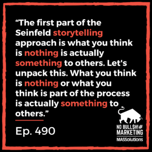 Gave you a tip, ask those open-ended questions, listen, track it, see what comes up. Continually survey, in a more formal way, clients, customers, employees, referral sources, people who refer to you, people who are in centers of influence that can connect you with someone. When you do these kinds of surveys, and they don’t have to be super formal, you have to listen, track, and then come back and tell them what you did. ‘You know what? We heard from so many people that this was so important, we weren’t even talking about that in our story. Now, it’s part of our story.’ Boy, that person that told you that has got a bounce in their step. They’re excited. They know you listened. Second thing is you got value from what they told you. Third thing is you’re now telling the story better, because you’ve discovered that everyday genius of your team. And you’ve incorporated into your story through the Seinfeld storytelling approach, part one, taking what you thought was nothing and then incorporating that into your story again and again and again.