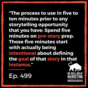 First, most people don’t look at each of those as a storytelling opportunity, they just go and do it. I’m not trying to slow you down, anybody that knows me, I’m not the most patient person. So I’m not trying to slow you down. But what I want you to do is spend five minutes on pre-story prep. And those five minutes start with actually being intentional about defining the goal of that story in that instance. ‘Oh, I’m going to present to my team, we’re going to go around the room. And everybody that reports to the boss has to give an update. I’m going to see that as a storytelling opportunity. And my goal is to help everyone around the room understand what’s been happening on my team, and how it benefits the company and them. I’ve been intentional about my goal.’